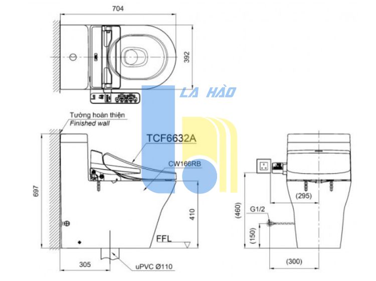 Bản vẽ kích thước bồn cầu TOTO điện tử CW166 nắp TCF6632 A