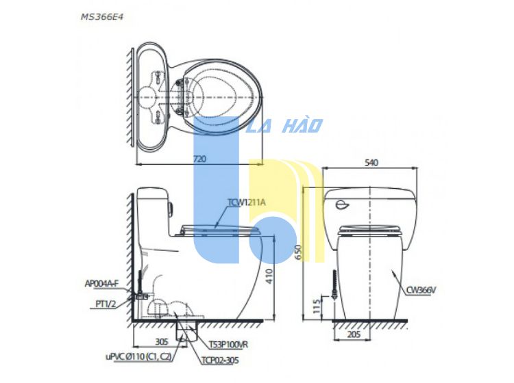 Bản vẽ bồn cầu MS366 nắp rửa cơ TCW1211A TOTO
