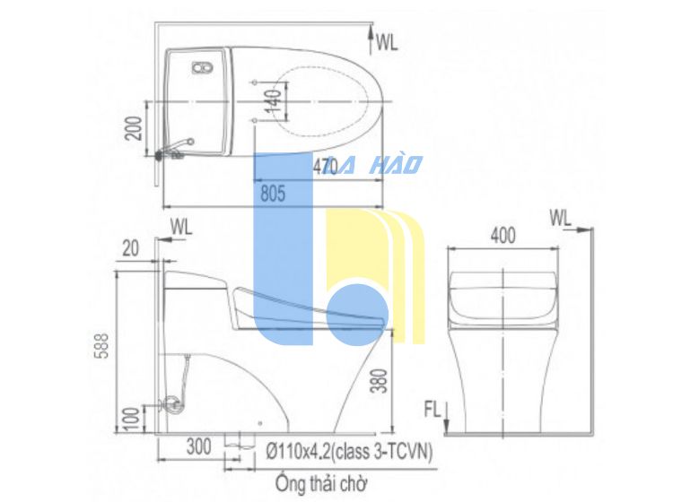 Kích thước bồn cầu: 805 x 400 x 588 mm (dài x rộng x cao)