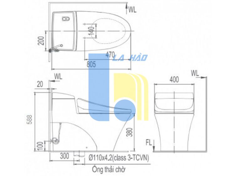 Kích thước bồn cầu: 805 x 400 x 588 mm (dài x rộng x cao)