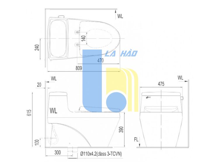 Kích thước bồn cầu: 809 x 475 x 615 mm (dài x rộng x cao)