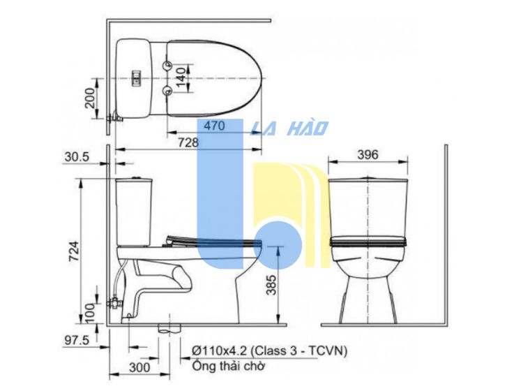 Kích thước bồn cầu: 728 X 396 X 724 mm (DxRxC)