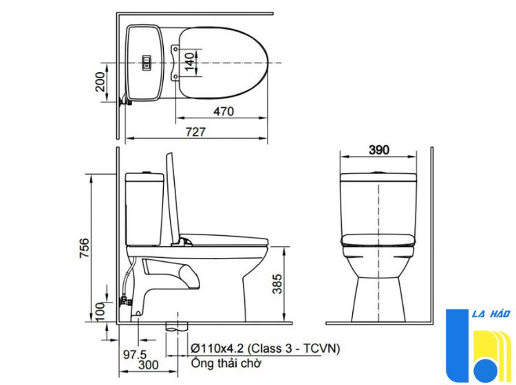 Kích thước bồn cầu: 733 x 390 x 756 mm (dài x rộng x cao)