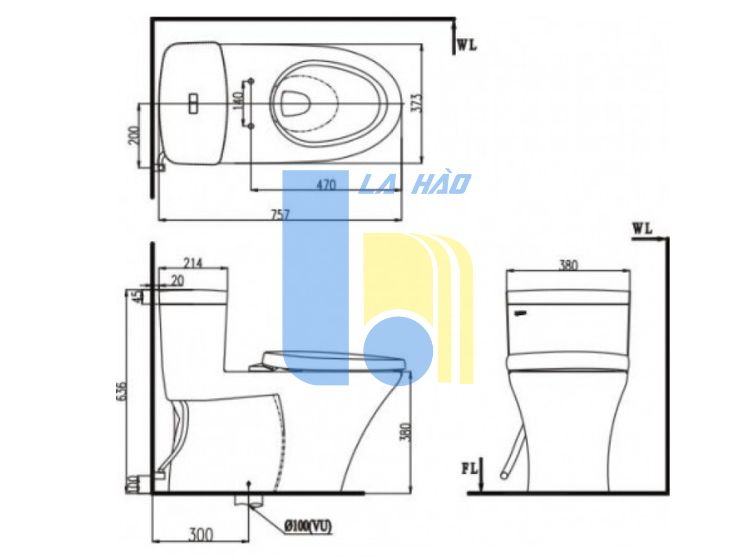 Kích thước bồn cầu: 757 x 380 x 636 mm (dài x rộng x cao)