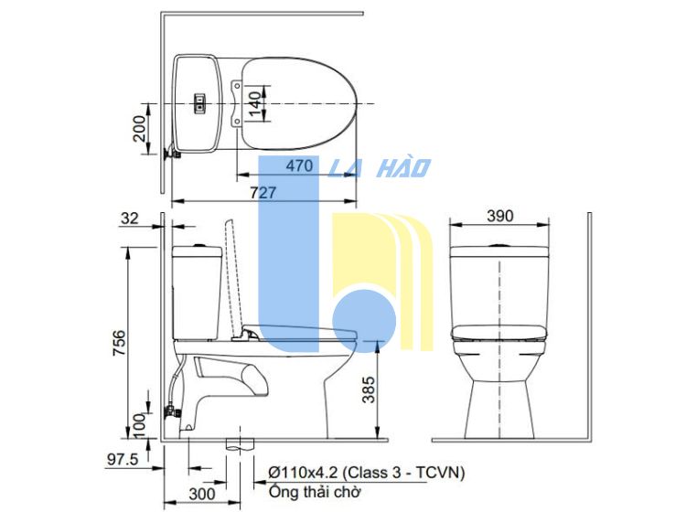 Kích thước bồn cầu: 733 x 390 x 756 mm (dài x rộng x cao)