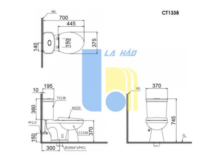 Bản vẽ kích thước bồn cầu CT1338 nắp rửa TAF050 caesar