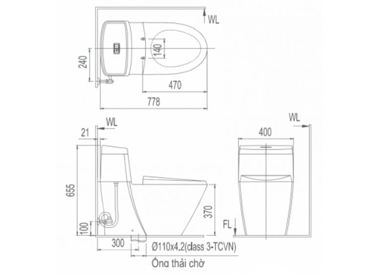 Kích thước bồn cầu: 778x 400x 655 mm (dài x rộng x cao)