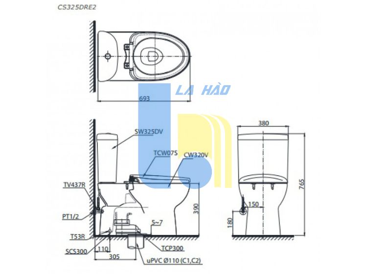 Bản vẽ bồn cầu CS325 nắp rửa cơ TCW07S TOTO