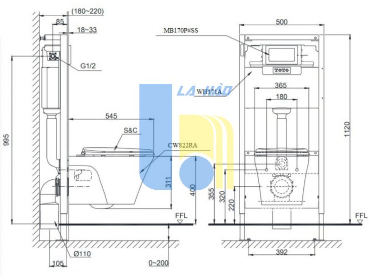 Bản vẽ kỹ thuật xí bệt CW822RA-MB170P#SS-WH171A