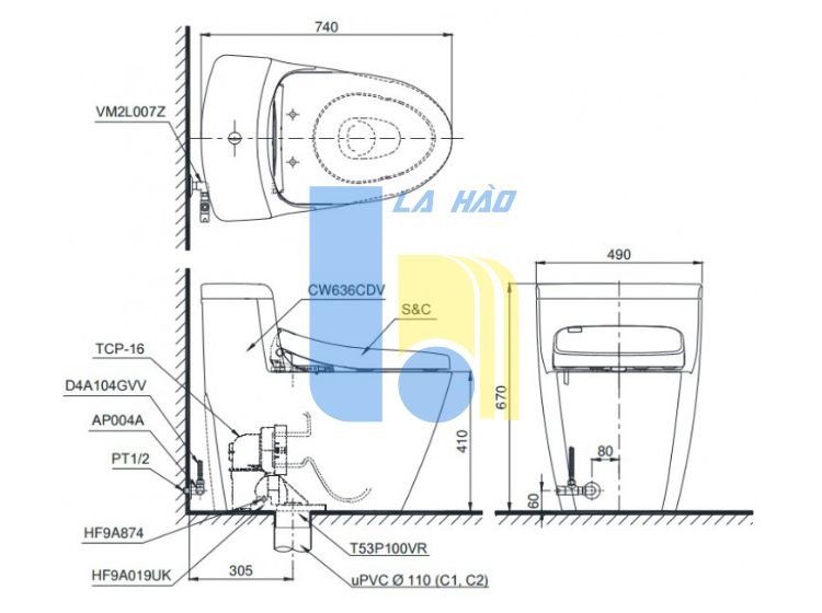 Bản vẽ kích thước bồn cầu TOTO C636